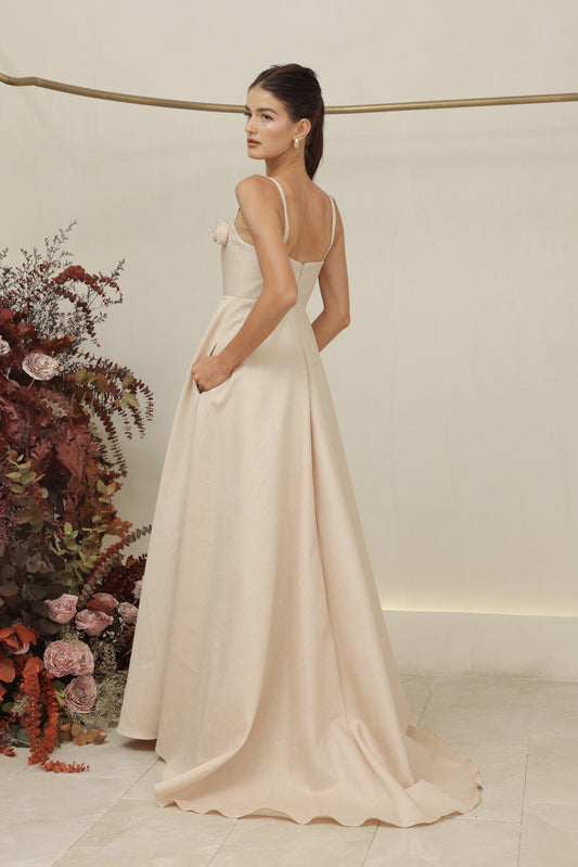 MARCELINE DRESS Straight Neckline Strappy Maxi Gown with Floral Details and Pockets (Nude Gazaar)Regular price ₱9,650.00Regular priceUnit price / per-
