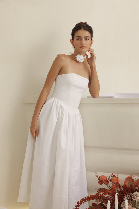 COCO DRESS Strapless Baroque Style Waist Midi Dress with Floral Neckpiece (White Linen)Regular price ₱4,990.00Regular priceUnit price / per-