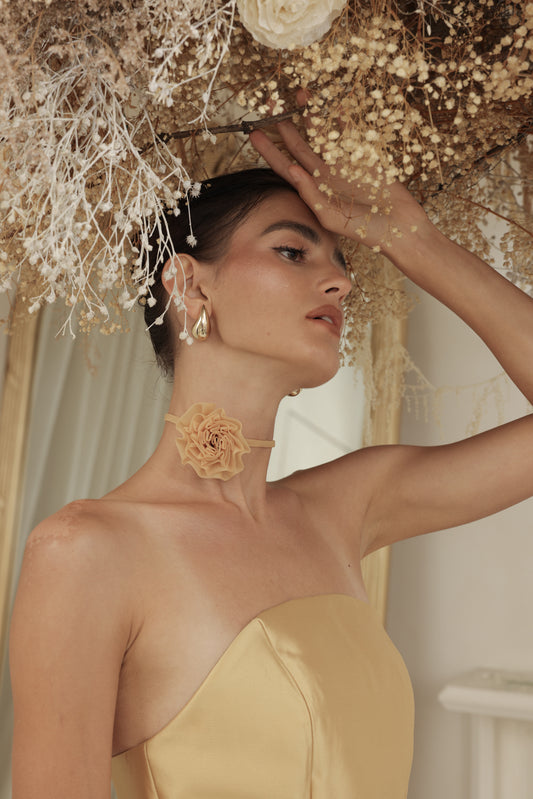 COCO DRESS Strapless Baroque Style Waist Midi Dress with Floral Neckpiece (Camel Linen)Regular price ₱4,990.00Regular priceUnit price / per-