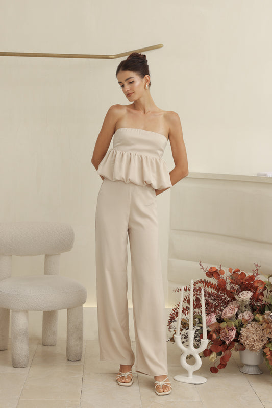 REMI PANT SET Strapless Peplum Top and Straight Cut Pant (Nude Silk Crepe)