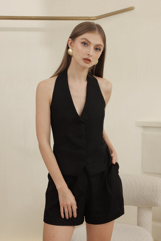 HARRIET SET Halter Vest and Pleated Trouser Short Set (Black Linen)
