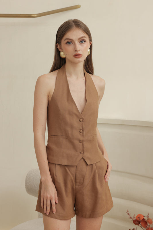 HARRIET SET Halter Vest and Pleated Trouser Short Set (Light Brown Linen)