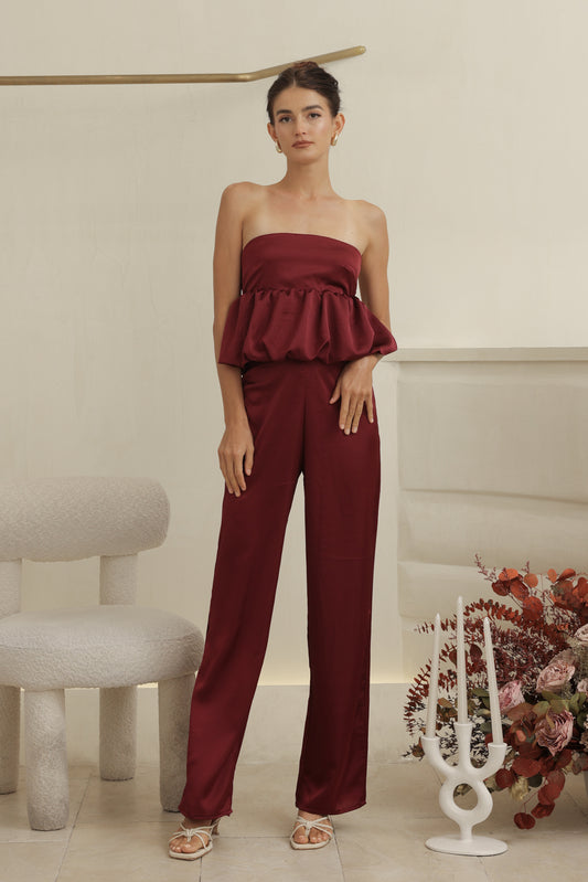 REMI PANT SET Strapless Peplum Top and Straight Cut Pant (Maroon Silk Crepe)