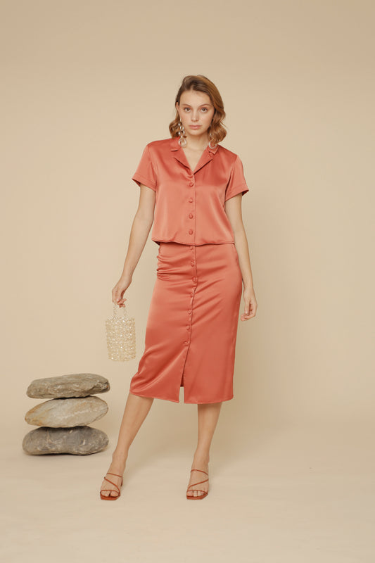 SALOME SET Silk Collared Blouse and Pencil Skirt with Covered Buttons (Rust Silk)