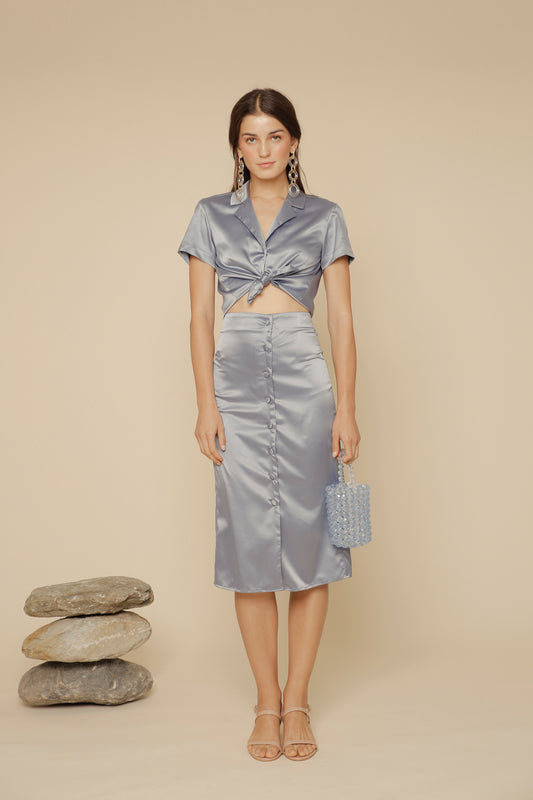 SALOME SET Silk Collared Blouse and Pencil Skirt with Covered Buttons (Serenity Blue Silk)