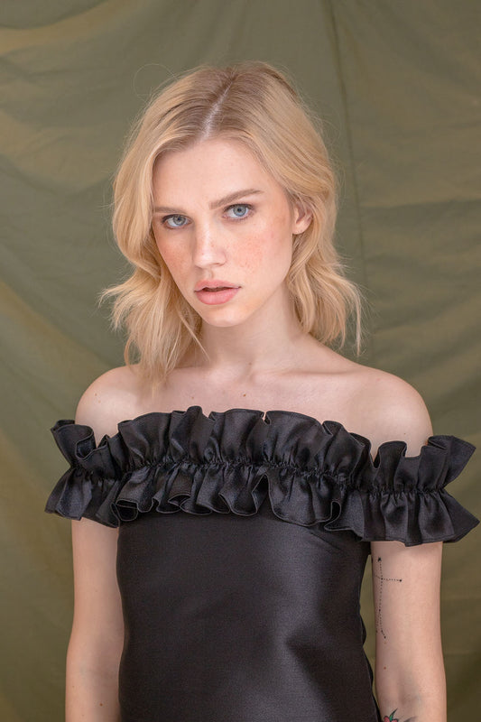 LUNA TOP Gazar Top with Oversize Ruffle Off Shoulder (Black Gazar)