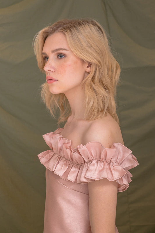 LUNA TOP Gazar Top with Oversize Ruffle Off Shoulder (Nude Gazar)
