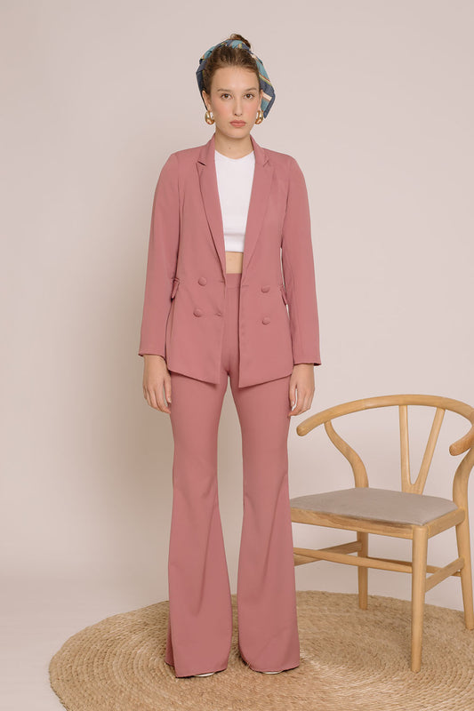 BUENA SET Bow Top with V Neckline and Flared High Waist Pant (Old Rose Crepe)