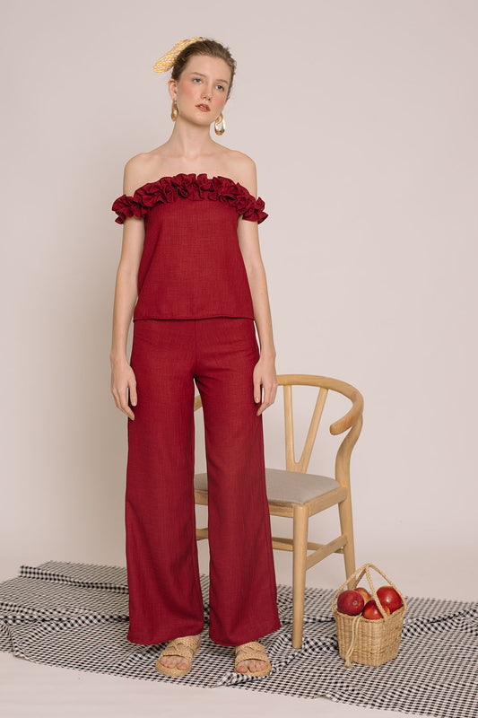 ELSA SET Ruffled Off Shoulder Top and Culottes (Maroon Crepe)