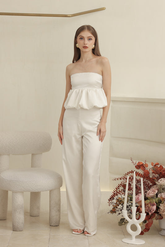 REMI PANT SET Strapless Peplum Top and Straight Cut Pant (Ivory White Silk Crepe)