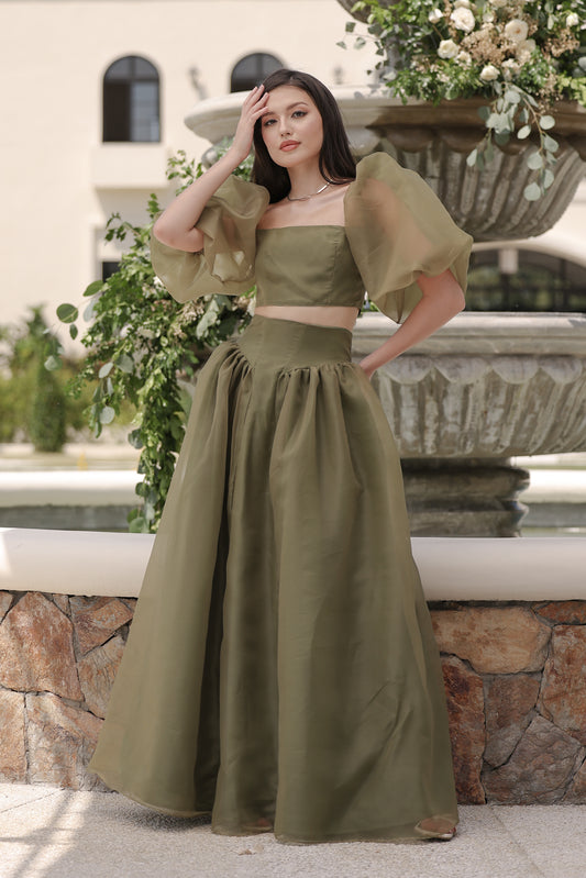PERLITA SET Puff Sleeve Top with Baroque Style High Waist Maxi Skirt (Olive Matte Organdy)
