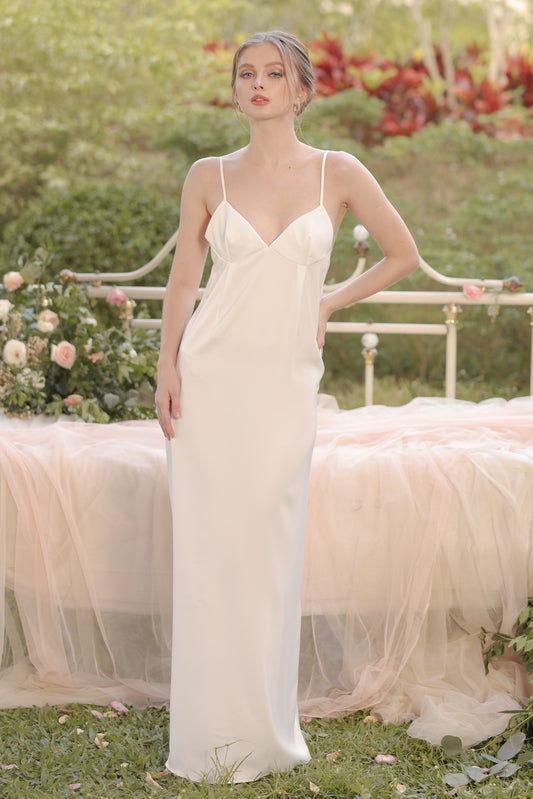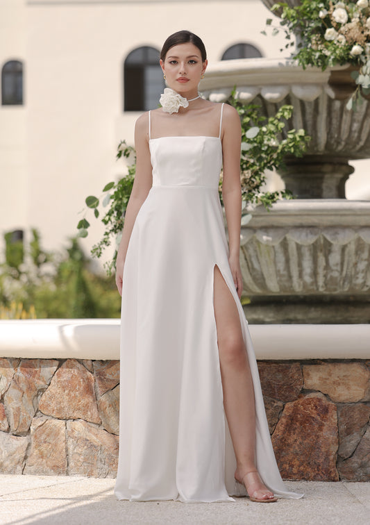 CELESTINA Strappy Slit Maxi Dress with Flower Neck Piece (Ivory Silk Crepe)