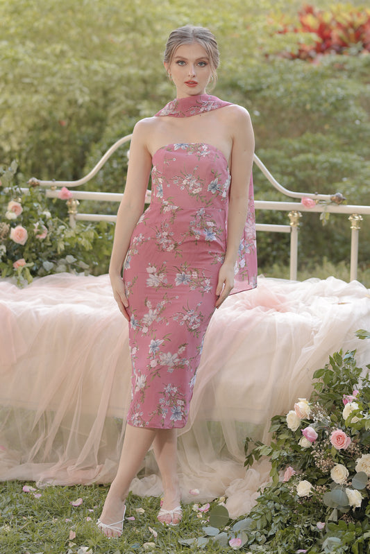 ROMA Strapless Curved Neckline Midi Dress with Silk Scarf (Floral Chiffon Mauve)