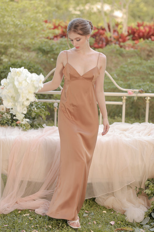 CELESTINA Strappy Slit Maxi Dress with Flower Neck Piece (Bronze Silk Crepe)