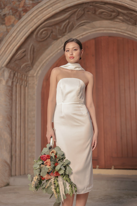 ROMA Strapless Curved Neckline Midi Dress with Silk Scarf (Ivory White Silk Crepe)