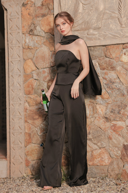FELICIDAD PANT SET Strapless Curved Neckline Top with Scarf and Pant Set (Black Silk Crepe)