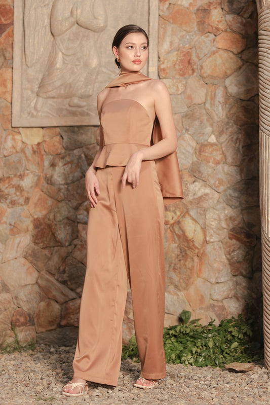 FELICIDAD PANT SET Strapless Curved Neckline Top with Scarf and Pant Set (Bronze Silk Crepe)
