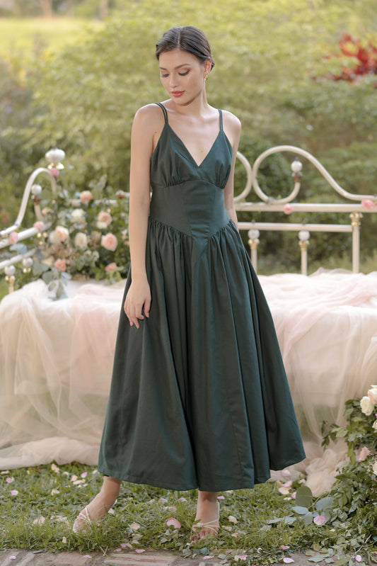 CONCETTA Baroque Style Midi Dress (Moss Green Linen)