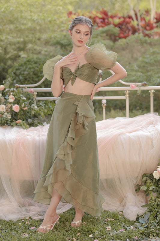 LUPE SET Crop Top with Wrap Ruffled Skirt (Olive Matte Organdy)
