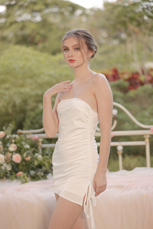 BLANCA Strapless Ruched Side Mini Silk Dress (Ivory White Silk Crepe)