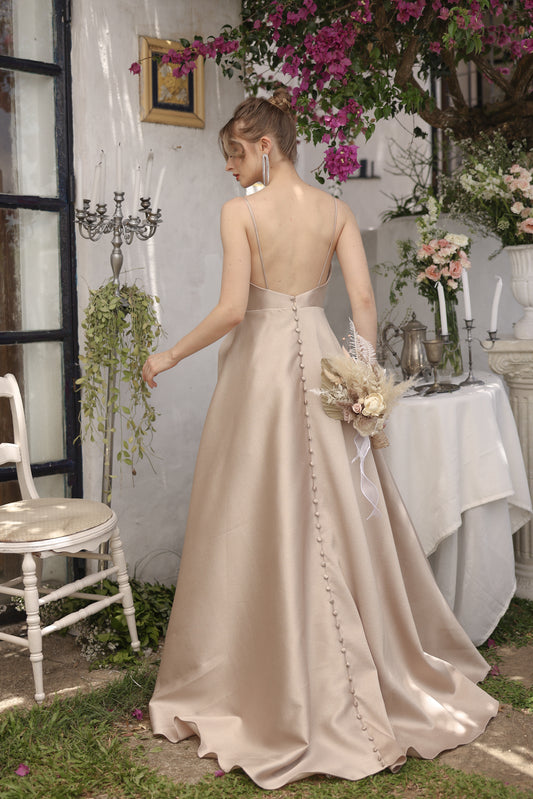 GALILEA GOWN Scoop Neckline Long Gown with Trail and Full Covered Button Back Detail (Tan Gazaar)