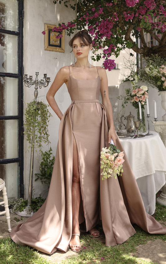 ANTONELLA GOWN Scoop Neckline High Slit Gown with Detachable Ball Skirt (Taupe Gazaar)