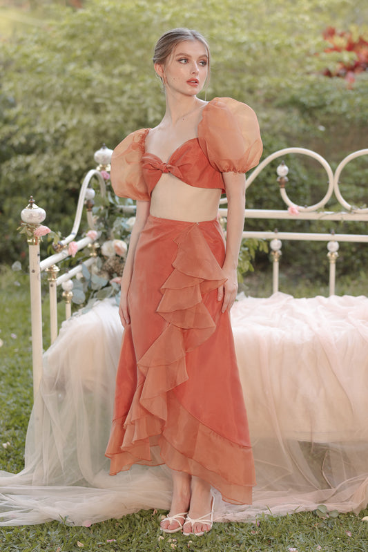 LUPE SET Crop Top with Wrap Ruffled Skirt (Rust Matte Organdy)