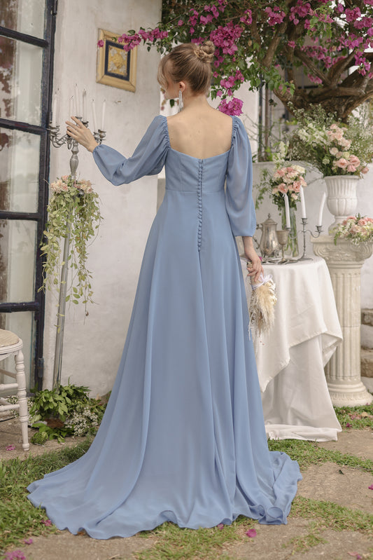 SIENNA Full Sleeve Chiffon Maxi Dress with Trail and Covered Button Back Detail (Serenity Blue Chiffon)