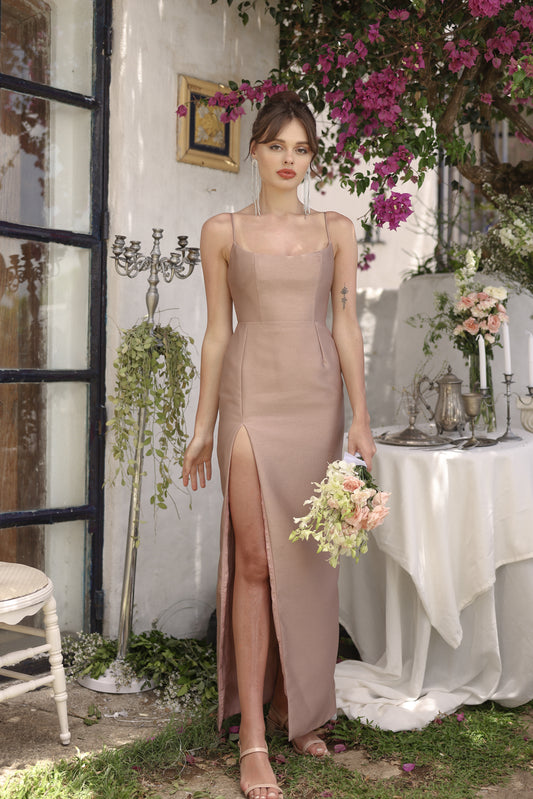 CAMPANA GOWN Scoop Neckline High Slit Gown (Taupe Gazaar)