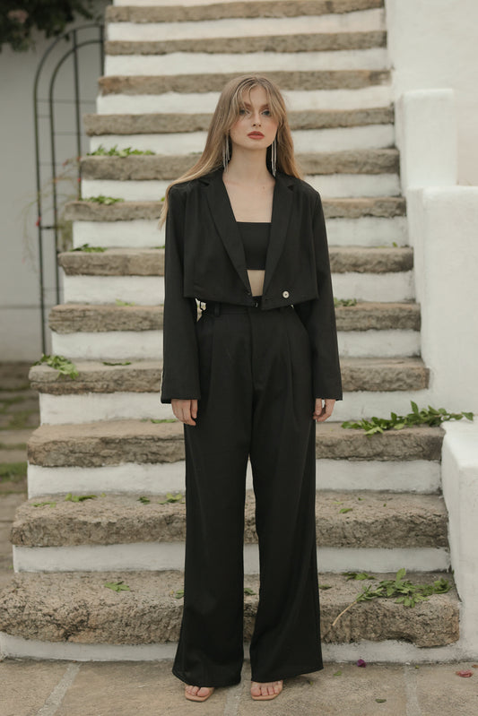 Discounted! GIUSTINA 3 PIECE SET Crop Blazer with Crop Bandeau and Pleated Trouser (Black Linen)