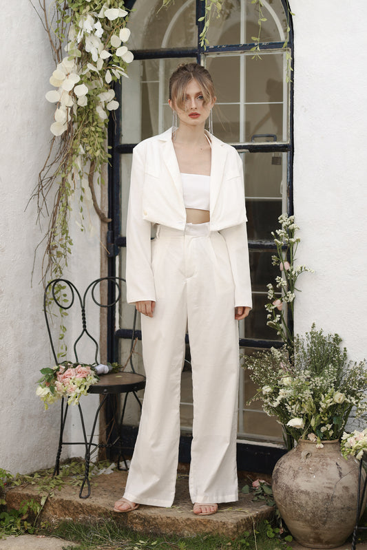 Discounted! GIUSTINA 3 PIECE SET Crop Blazer with Crop Bandeau and Pleated Trouser (White Linen)