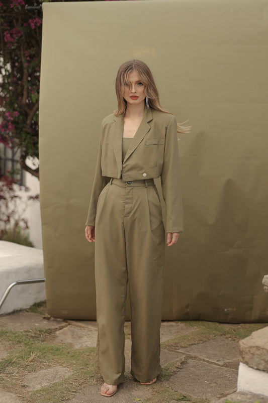 Discounted! GIUSTINA 3 PIECE SET Crop Blazer with Crop Bandeau and Pleated Trouser (Olive Linen)