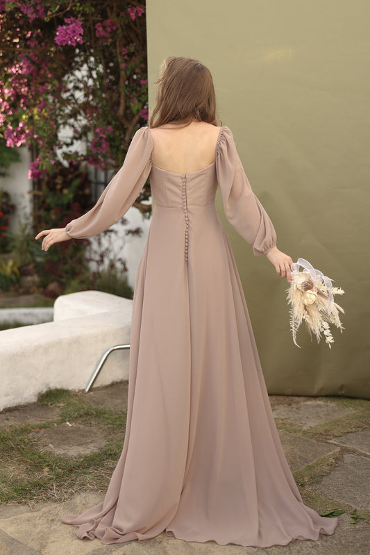 SIENNA Full Sleeve Chiffon Maxi Dress with Trail and Covered Button Back Detail (Taupe Chiffon)