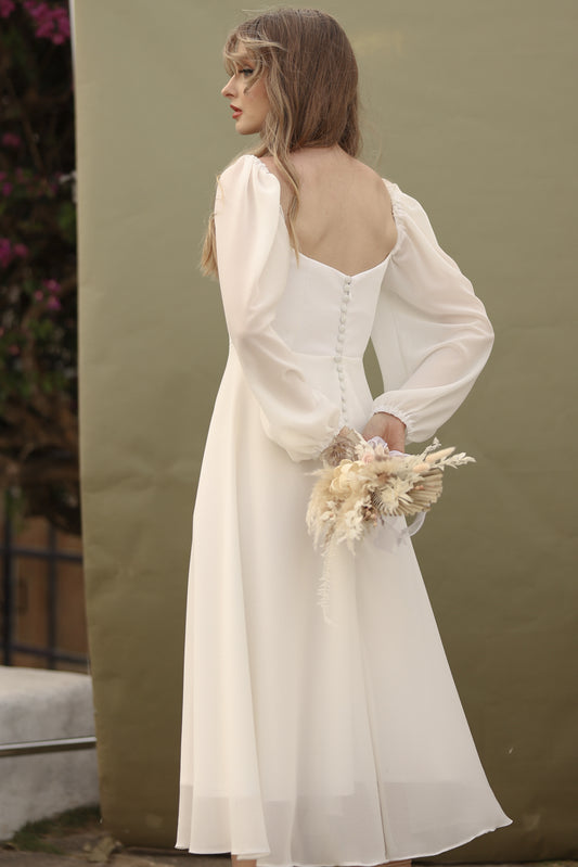 BRIA Full Sleeve Chiffon Midi Dress with Covered Button Back Detail (White Chiffon)