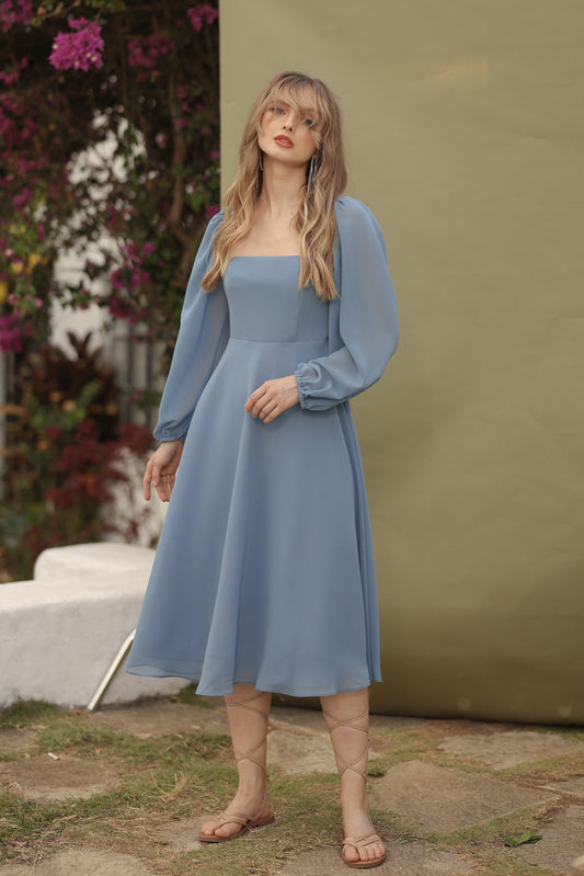 BRIA Full Sleeve Chiffon Midi Dress with Covered Button Back Detail (Serenity Blue Chiffon)