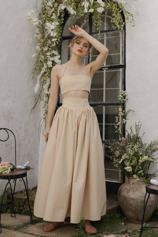 ZETA SET Crop Bandeau Top and High Waist Baroque Style Midi Skirt (Nude Linen)