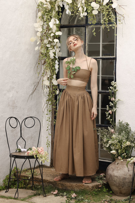 ZETA SET Crop Bandeau Top and High Waist Baroque Style Midi Skirt (Light Brown Linen)