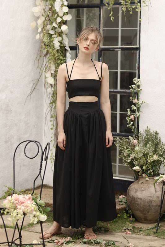 ZETA SET Crop Bandeau Top and High Waist Baroque Style Midi Skirt (Black Linen)