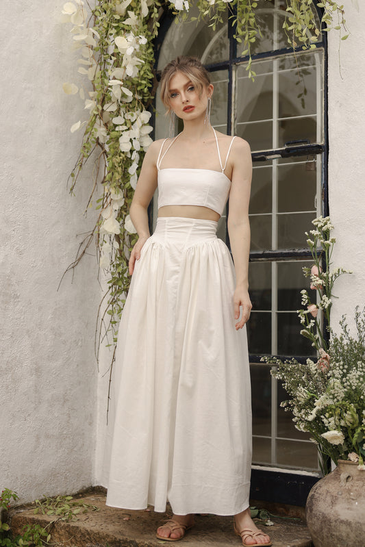 ZETA SET Crop Bandeau Top and High Waist Baroque Style Midi Skirt (White Linen)