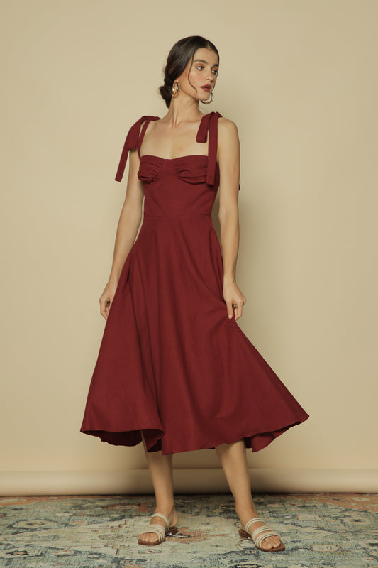 FOSETTE Tie on Shoulder Midi Dress with Gathered Cup (Maroon Linen)Regular price ₱3,290.00Regular priceUnit price / per