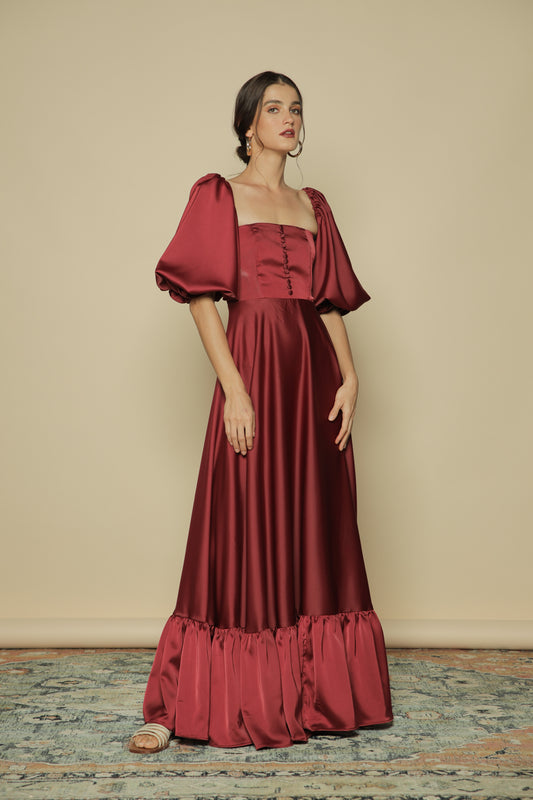 FIRA Two Way Puff Sleeve Maxi Dress with Covered Buttons and Square Neckline (Maroon Silk)Regular price ₱5,490.00Regular priceUnit price / per-