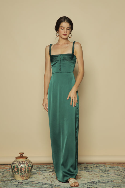 DELPHINE Gathered Strap Maxi Dress with Covered Button Detail (Emerald Green Silk)Regular price ₱3,990.00Regular priceUnit price / per-