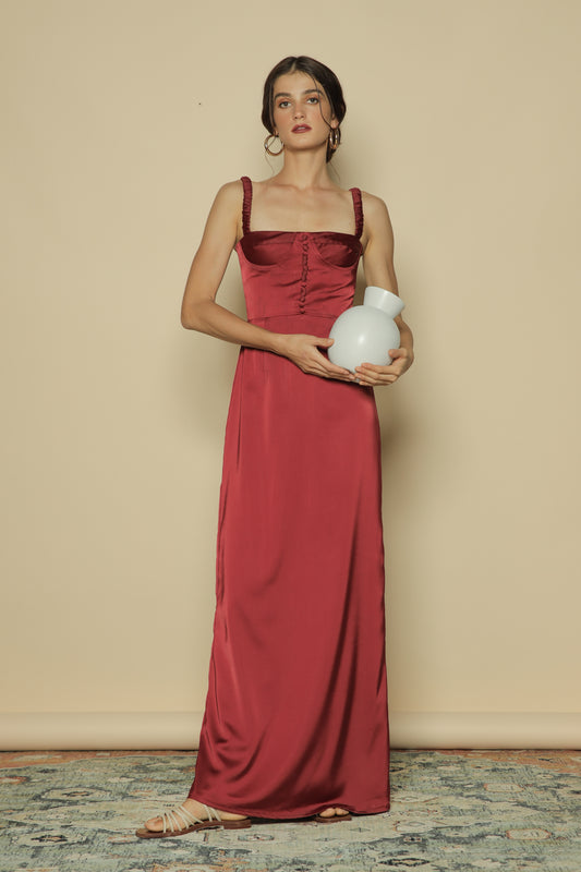 DELPHINE Gathered Strap Maxi Dress with Covered Button Detail (Maroon Silk)Regular price ₱3,990.00Regular priceUnit price / per-