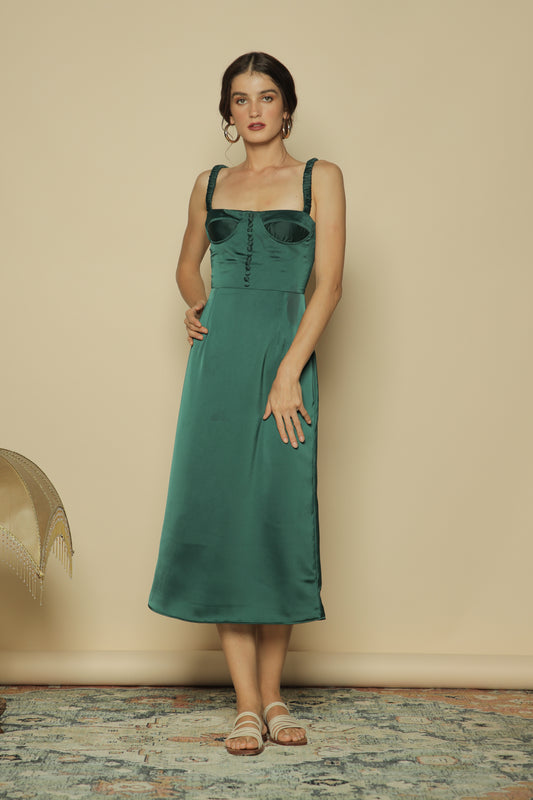 BRIGITTE Gathered Strap Midi dress with Covered Button Detail (Emerald Silk)Regular price ₱3,499.00Regular priceUnit price / per-