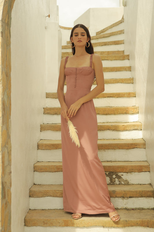 DELPHINE Gathered Strap Maxi Dress with Covered Button Detail (Old Rose Silk)Regular price ₱3,990.00Regular priceUnit price / per-