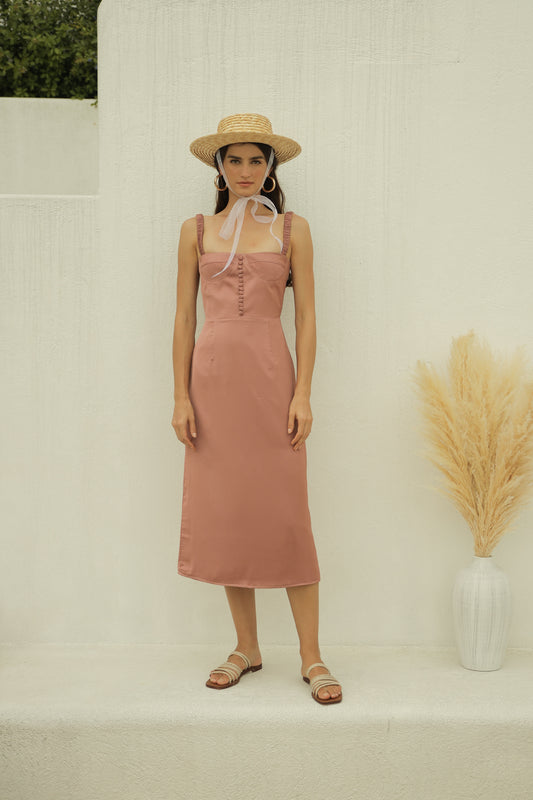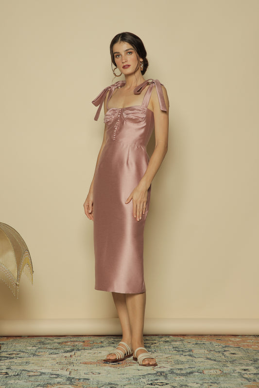 BRIGITTE Gathered Strap Midi dress with Covered Button Detail (Old Rose Silk)Regular price ₱3,499.00Regular priceUnit price / per-