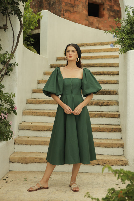 MARSEILLE Two Way Puff Sleeve Midi Dress with Covered Buttons and Square Neckline (Hunter Green Crepe)Regular price ₱3,690.00Regular priceUnit price / per-