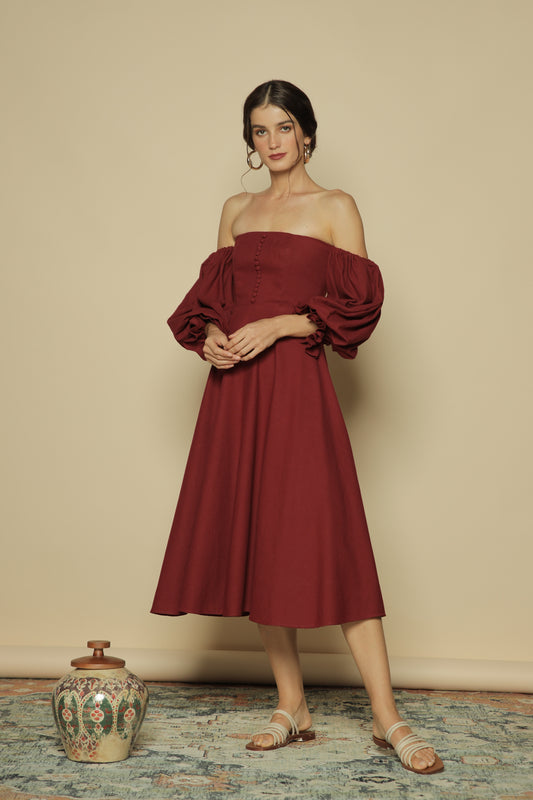 MARSEILLE Two Way Puff Sleeve Midi Dress with Covered Buttons and Square Neckline (Maroon Linen)Regular price ₱3,690.00Regular priceUnit price / per-