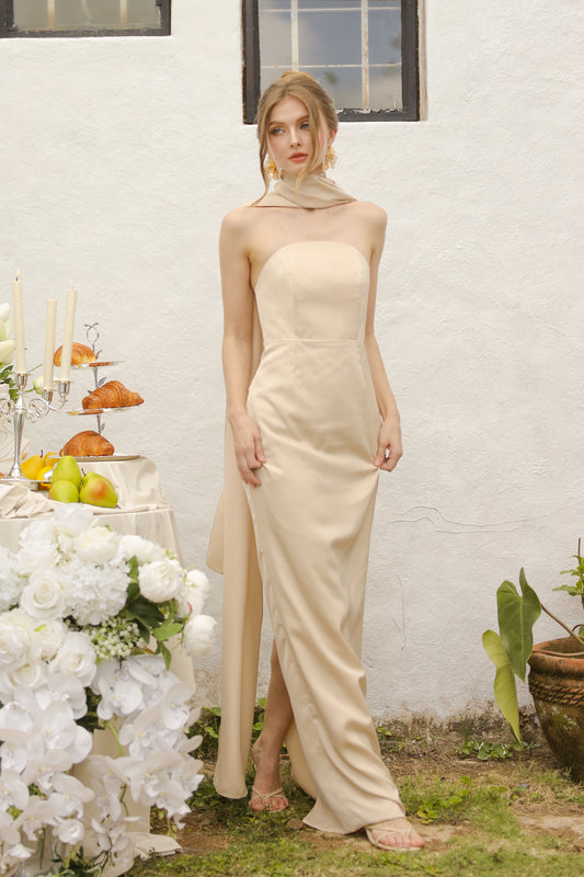 SELENA Strapless Flowy Maxi with Sash Neckpiece (Nude Charmeuse Silk)