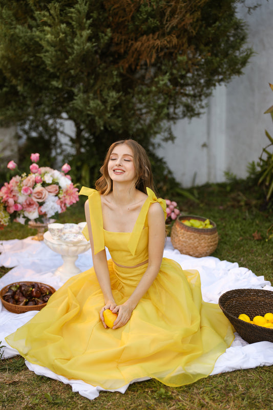 DOMIKA Sleeveless Bow Midi Dress with Drop Waist Shirred Skirt (Butter Yellow Matte Organdy)